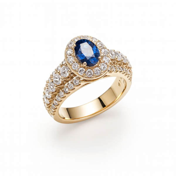 Oval Blue Sapphire & Diamond Halo Ring in 14K Yellow Gold