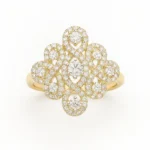 Crafted in lustrous yellow gold, the ornate latticework enhances the brilliance of each diamond, ensuring timeless elegance and sophistication. Whether worn as an evening piece, a cocktail ring, or to celebrate life’s most precious moments, this ring embodies luxury and refinement.