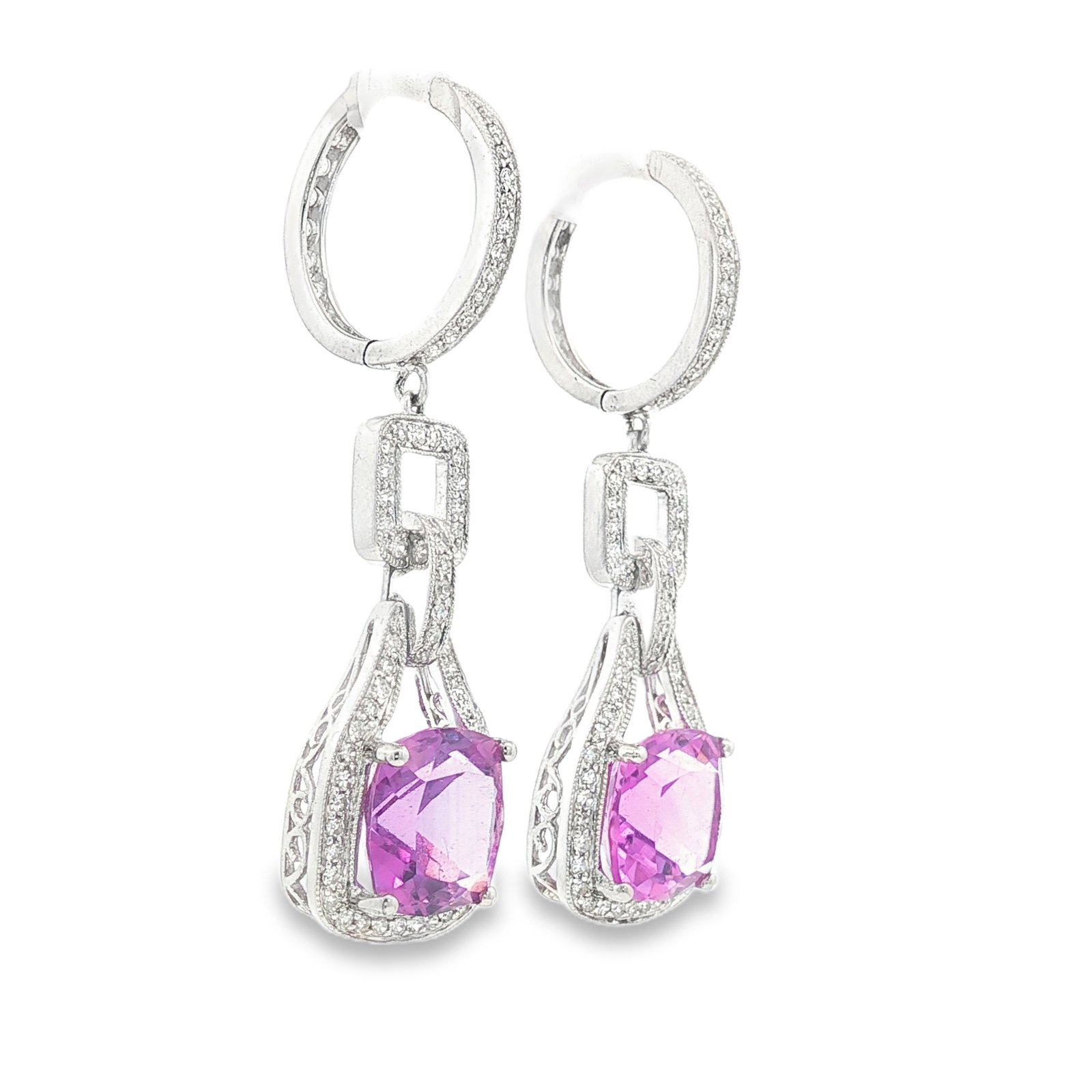 Add a touch of vintage glamour to your look with these exquisite Pink Sapphire and Diamond Art Deco Drop Earrings, masterfully crafted in 14K white gold. Each earring showcases a stunning cushion-cut pink sapphire radiant and full of life framed by a halo of pavé-set diamonds that amplify its brilliance.