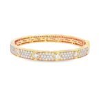 Elevate your wristwear with this exquisite two-tone diamond bangle bracelet, a stunning fusion of modern artistry and timeless luxury. Crafted in yellow and rose gold, the bracelet showcases a bold design where round bezel-set diamonds are beautifully framed along the surface, alternating with rows of pavé-set diamonds that create a dazzling, continuous sparkle.