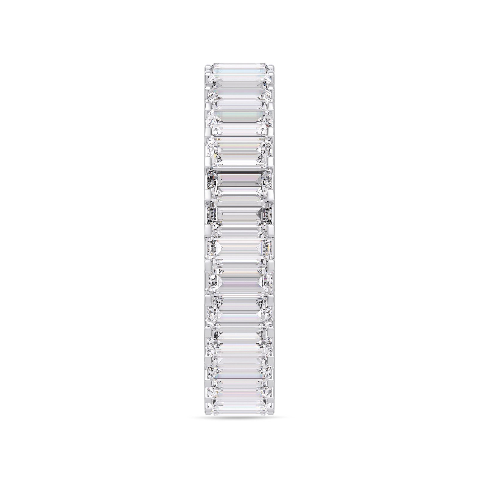 A striking white gold eternity band featuring a continuous circle of vertically set emerald-cut diamonds. The clean, elongated facets create a sophisticated hall-of-mirrors effect, delivering refined brilliance with architectural precision.