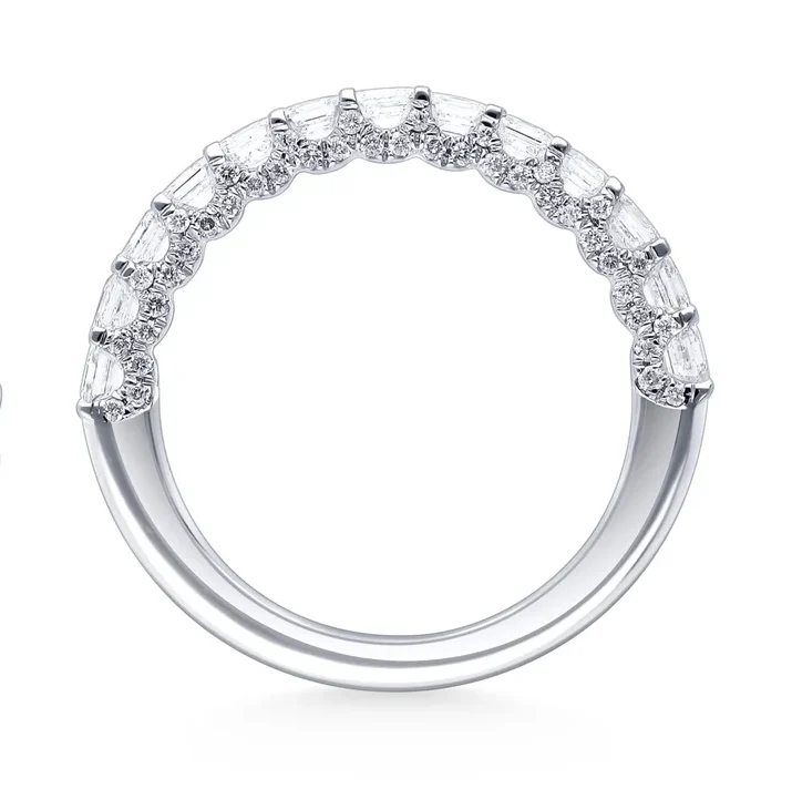 A dazzling blend of brilliance and elegance, this semi-eternity band is crafted in luminous white gold and adorned with a series of emerald-cut diamonds across the front. Each emerald-cut diamond is haloed by sparkling round diamonds, enhancing the stone’s natural fire while adding dimension and texture. The design continues with delicate diamond accents cascading gracefully along the sides of the band, ensuring sparkle from every angle.