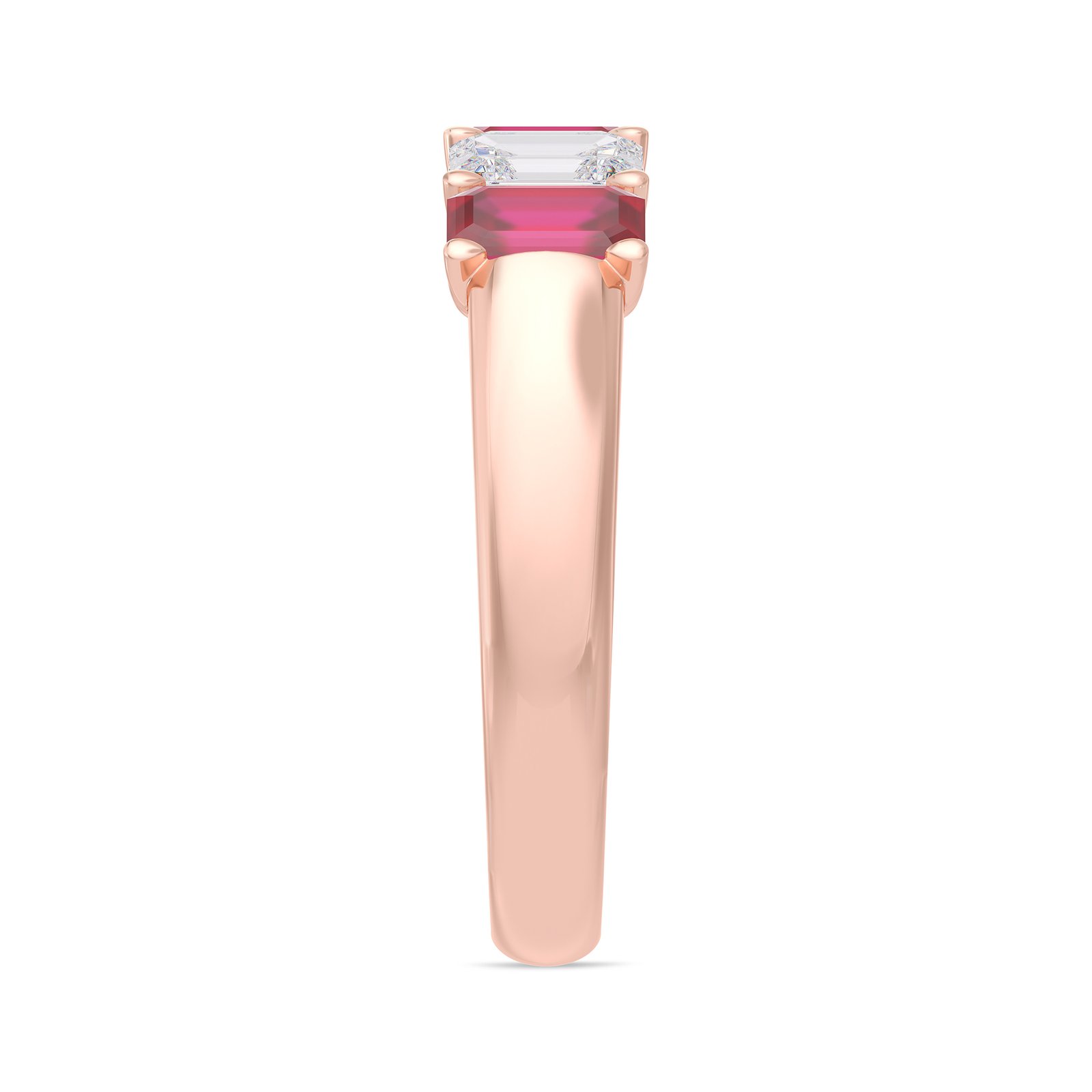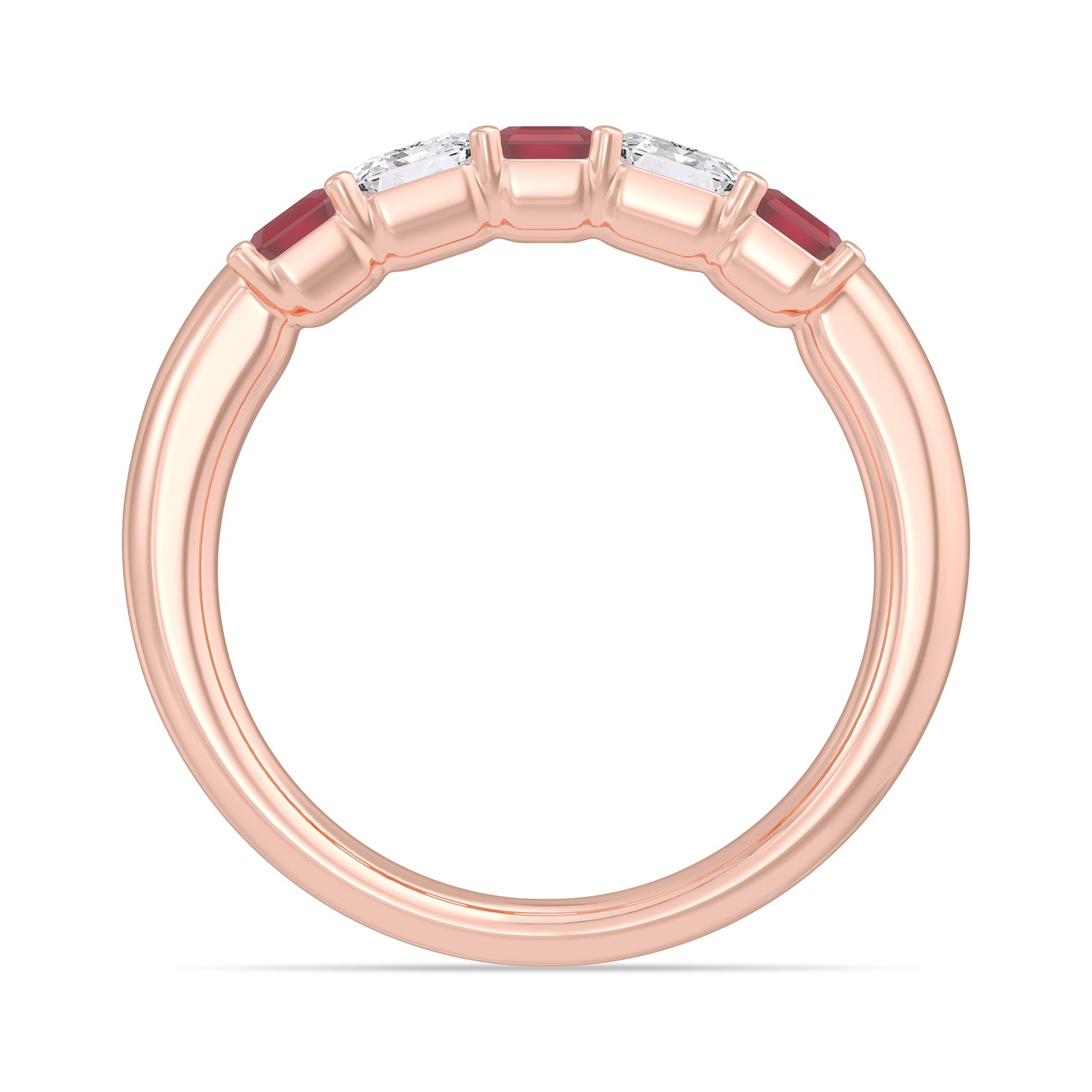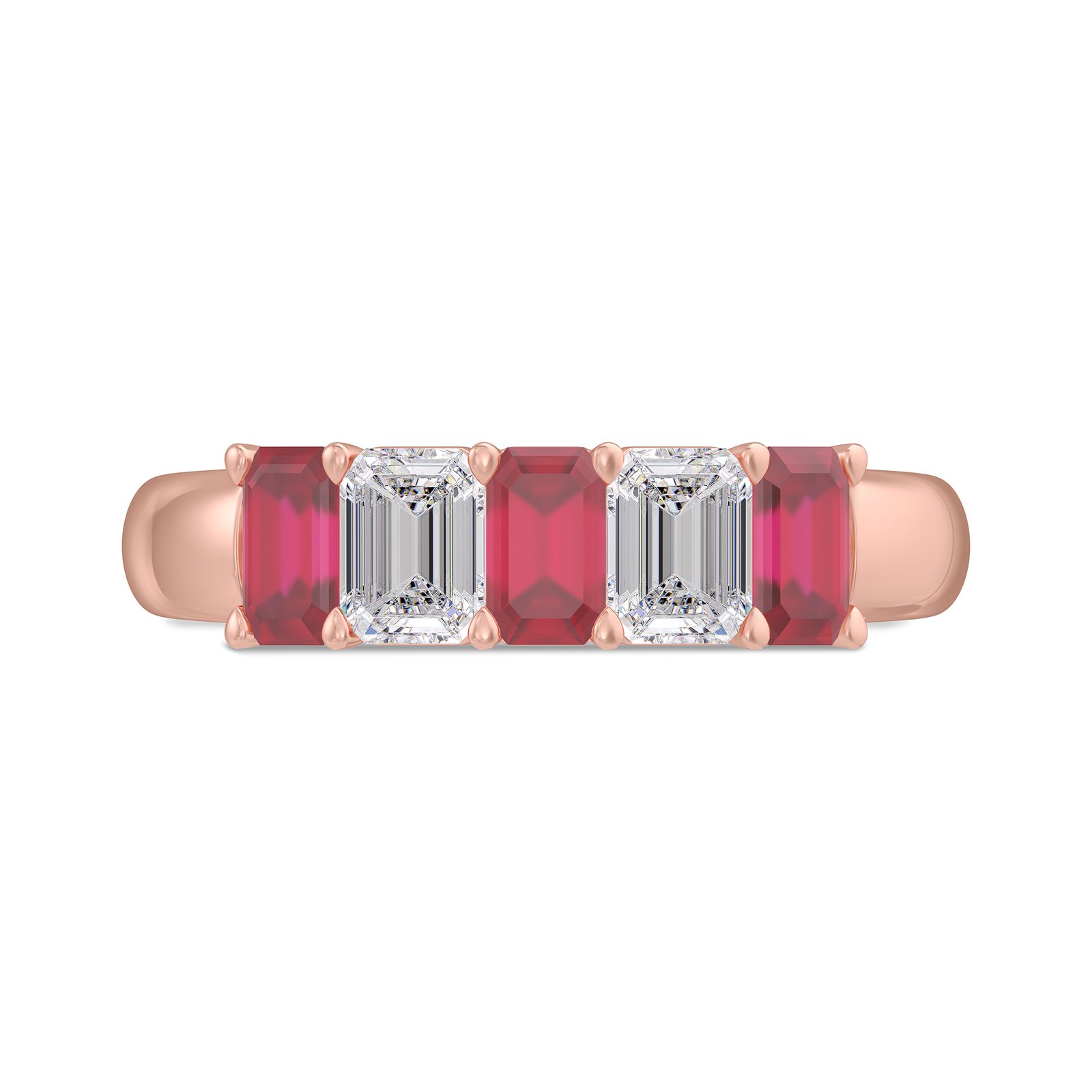 Romantic, refined, and effortlessly elegant, this emerald-cut ruby and diamond five-stone band is a timeless expression of passion and sophistication. Crafted in warm, polished rose gold, the ring features a graceful alternating arrangement of emerald-cut red rubies and emerald-cut white diamonds, creating a harmonious balance of rich color and brilliant clarity.