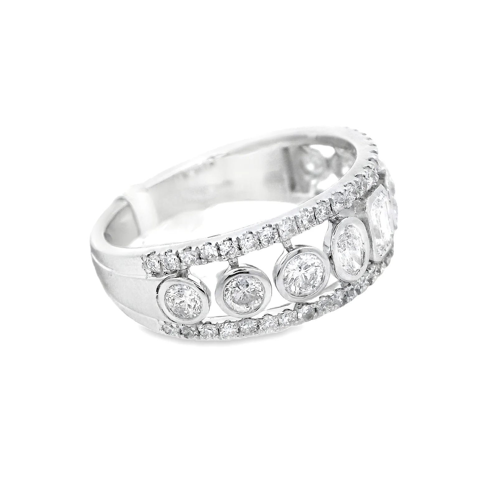Two rows of meticulously set round diamonds frame the center row, creating a luxurious three-band illusion that maximizes brilliance from every angle. Crafted in luminous white gold, this piece exudes timeless charm and exceptional style, making it a perfect choice for an anniversary band, wedding ring, or a statement piece for special occasions.