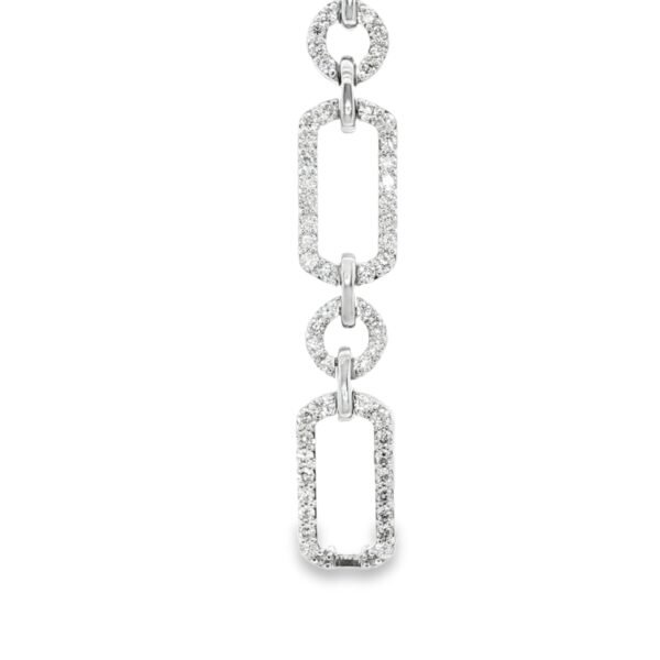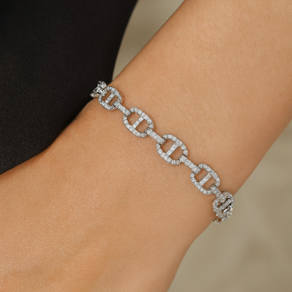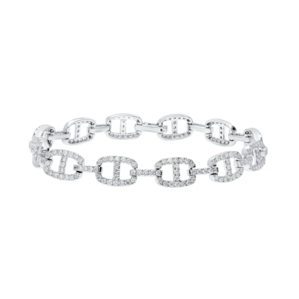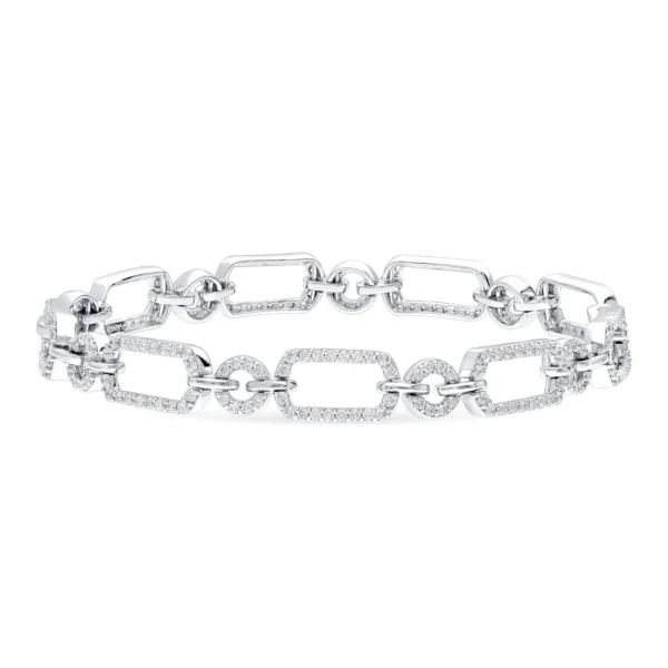 Step into a world of contemporary sophistication with the “Eternal Radiance” Diamond Link Bracelet, where classic glamour meets architectural artistry. Crafted from lustrous 14K white gold, each open rectangular link is meticulously encrusted with pavé-set brilliant diamonds, creating a seamless chain of light that dances with every movement.