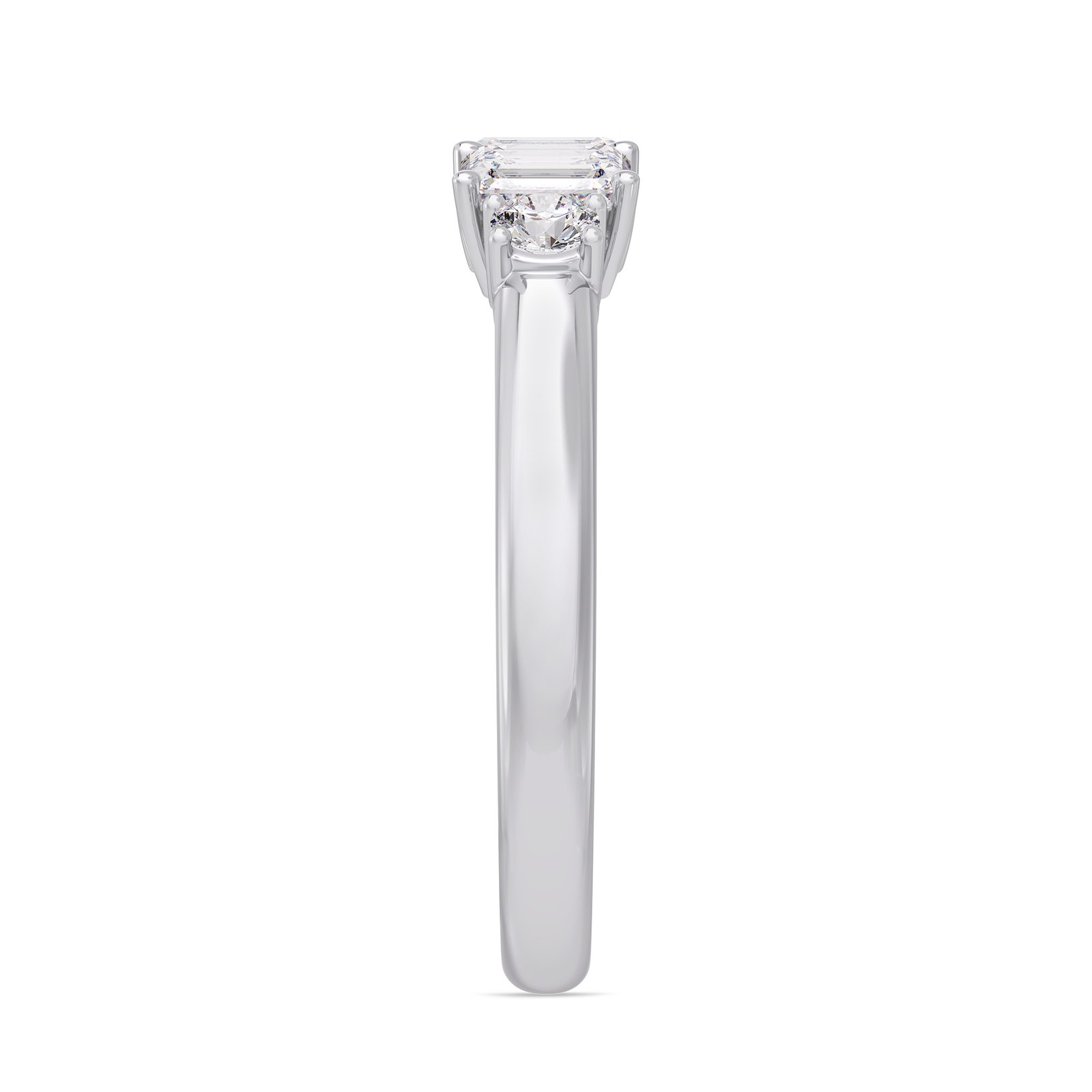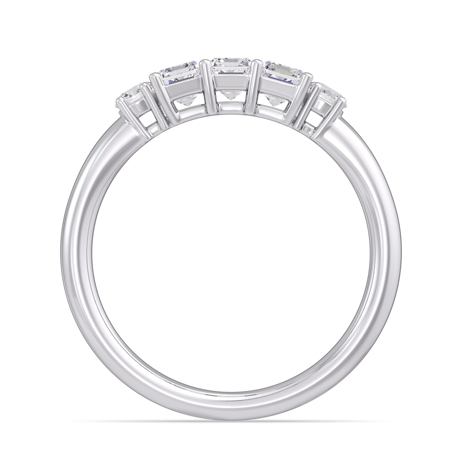A refined white gold ring featuring a horizontal row of five baguette-cut diamonds at the center, flanked by tapered diamond accents on each side. The clean linear arrangement offers structured brilliance with a sleek, minimalist silhouette.