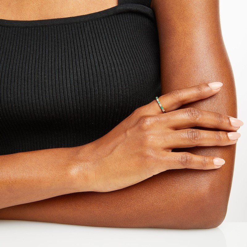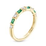 Celebrate timeless sophistication with this Yellow Gold Emerald & Diamond Alternating Band Ring. Crafted in luminous yellow gold, this exquisite band features a striking sequence of baguette-cut emeralds and round brilliant diamonds, set in a refined alternating design. The deep green of the emeralds contrasts beautifully with the radiant sparkle of the diamonds, creating a perfect balance of color and brilliance.