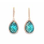 Grace your look with the mesmerizing allure of these London Blue Topaz and Diamond Halo Drop Earrings, exquisitely crafted in 18K rose gold. Each earring features a large, pear-shaped London blue topaz gemstone with a precision-cut checkerboard surface that radiates a deep oceanic brilliance. Surrounding each center stone is a delicate halo of round brilliant-cut diamonds, enhancing the topaz’s captivating depth with a touch of sparkling contrast.