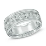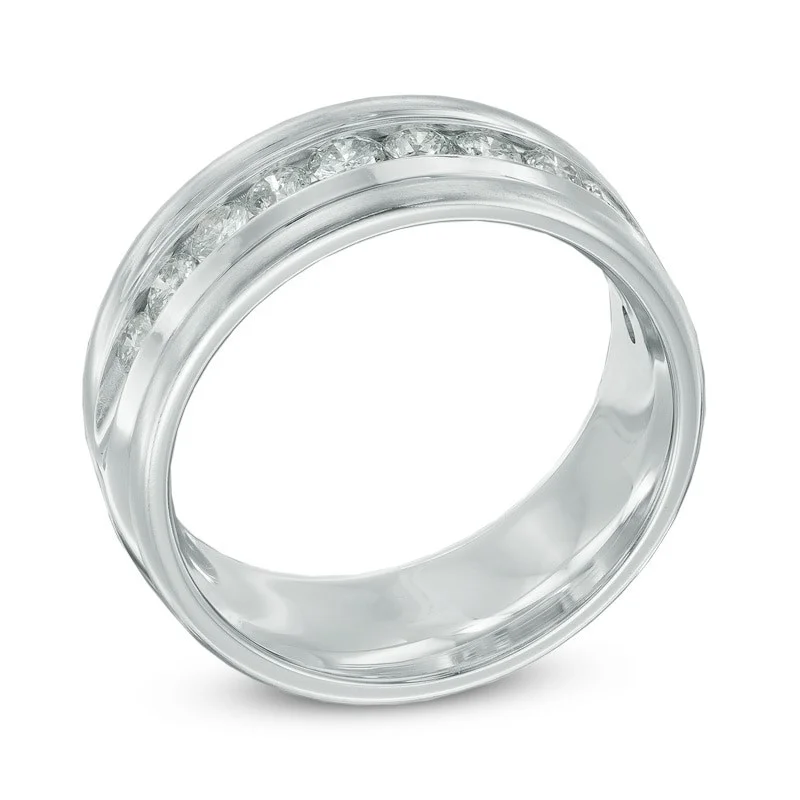 Refined, bold, and effortlessly sophisticated, this Men’s Channel-Set Diamond Wedding Band in 14K white gold combines timeless craftsmanship with a modern edge. A row of brilliant round-cut diamonds is securely channel-set at the center, delivering a sleek and continuous stream of sparkle across the polished band.