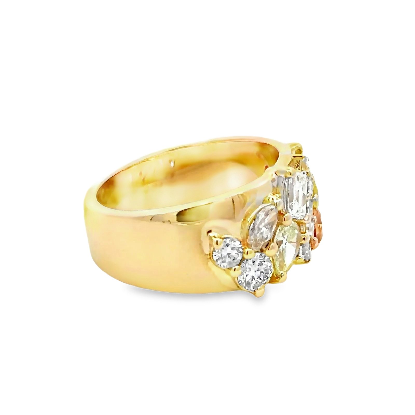 The wide rose gold band provides a warm and modern foundation, enhancing the rich hues of the fancy diamonds while offering both comfort and statement appeal. Perfect for those who appreciate bold luxury and artistic craftsmanship, this ring effortlessly transitions from day to night, making it a timeless addition to any fine jewelry collection.