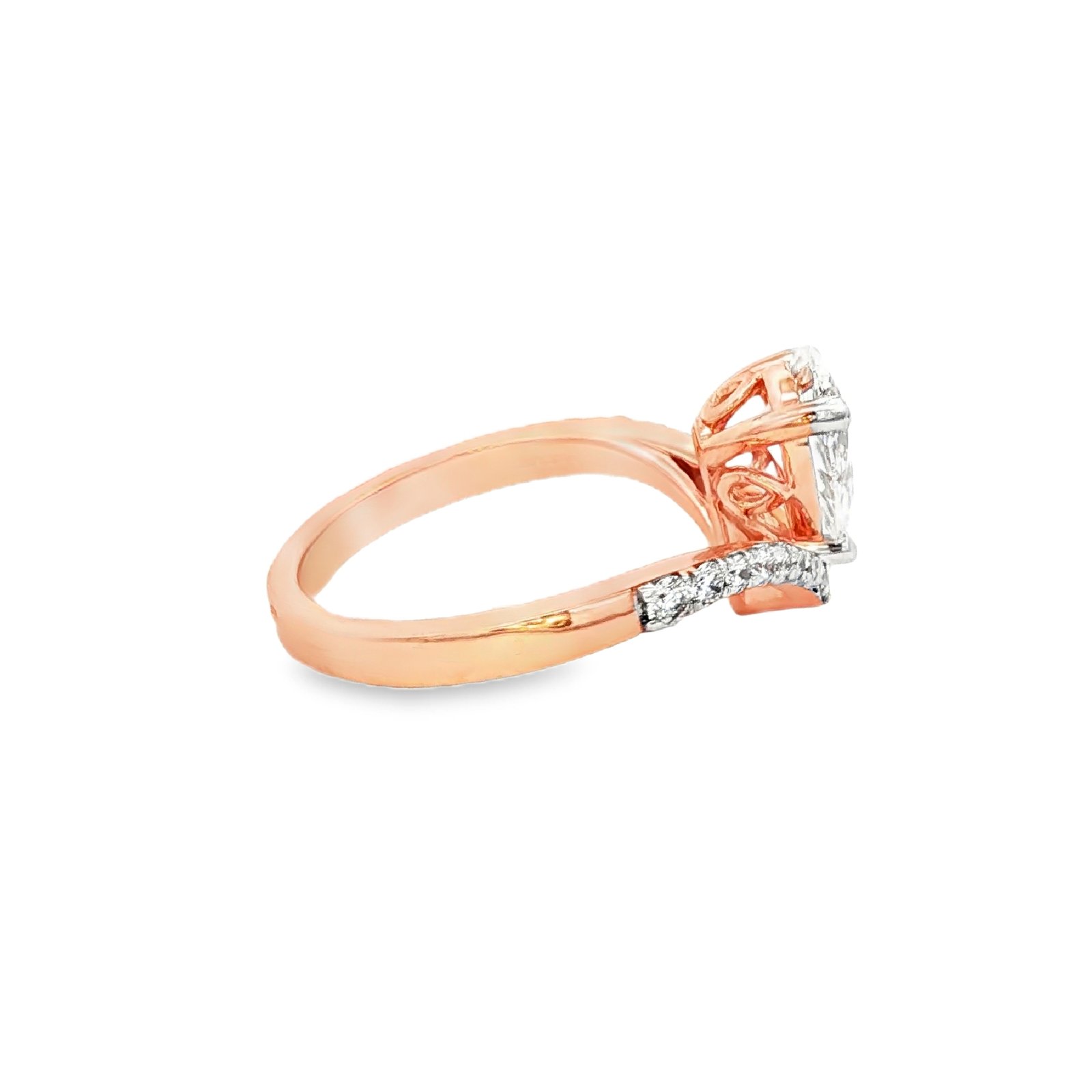 Celebrate your forever moment with the brilliance of this Pear-Cut Lab-Grown Diamond Engagement Ring. Expertly crafted in radiant rose gold, the ring features a stunning pear-shaped lab-grown diamond at its center, gracefully cradled by white gold prongs. A shimmering V-shaped band encrusted with pavé-set diamonds enhances the sparkle, symbolizing love that leads the way. This modern yet timeless design is perfect for the eco-conscious bride who seeks elegance with a meaningful touch.