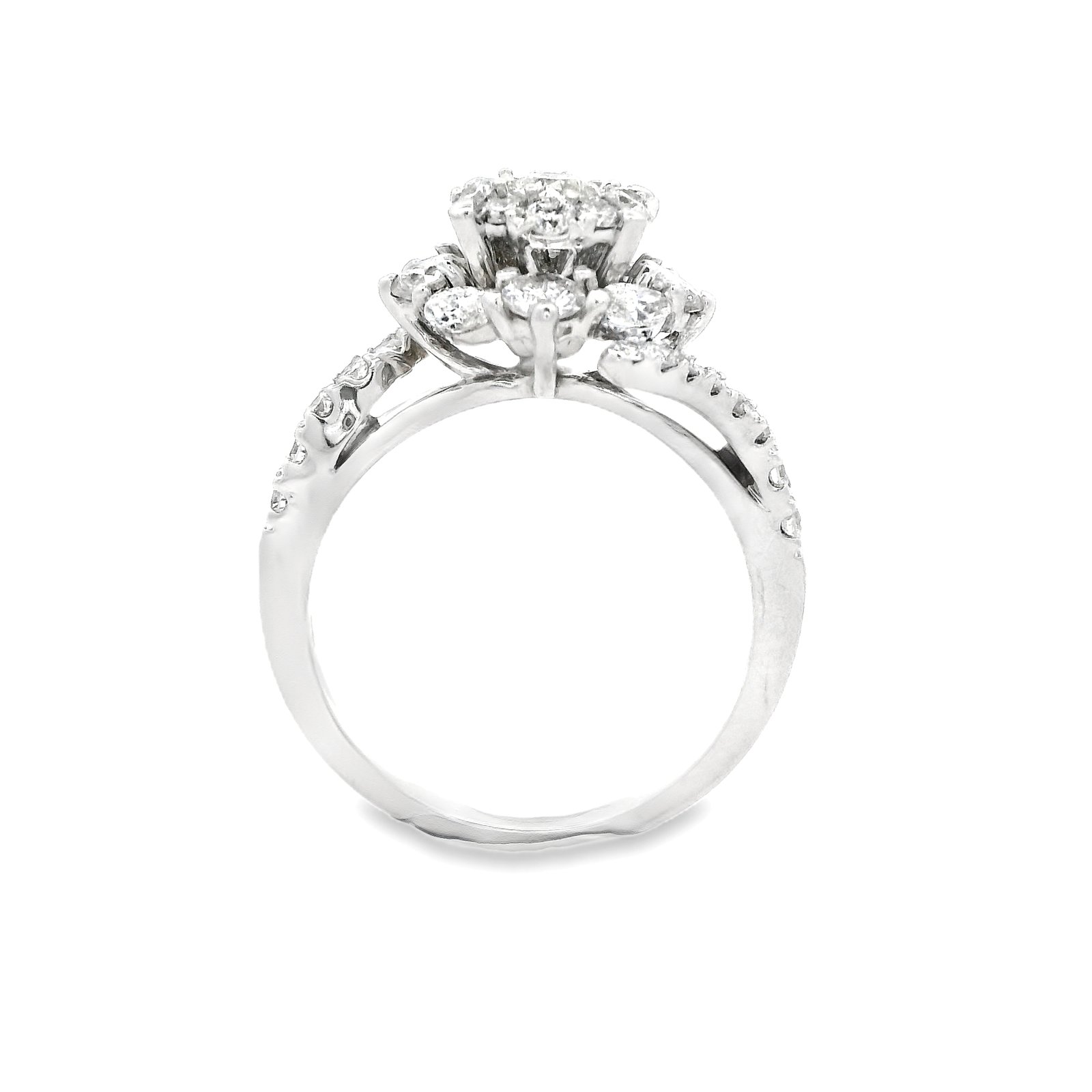 Celebrate everlasting love with the Radiant Halo Cluster Diamond Engagement Ring. This breathtaking piece is crafted in brilliant white gold and features a stunning round-cut center diamond, surrounded by two layers of shimmering diamond halos that enhance its brilliance and sparkle. The split shank band, adorned with additional pavé-set diamonds, adds depth and elegance to this dazzling design. A timeless expression of devotion, this ring is perfect for marking your most meaningful moments with unmatched radiance.