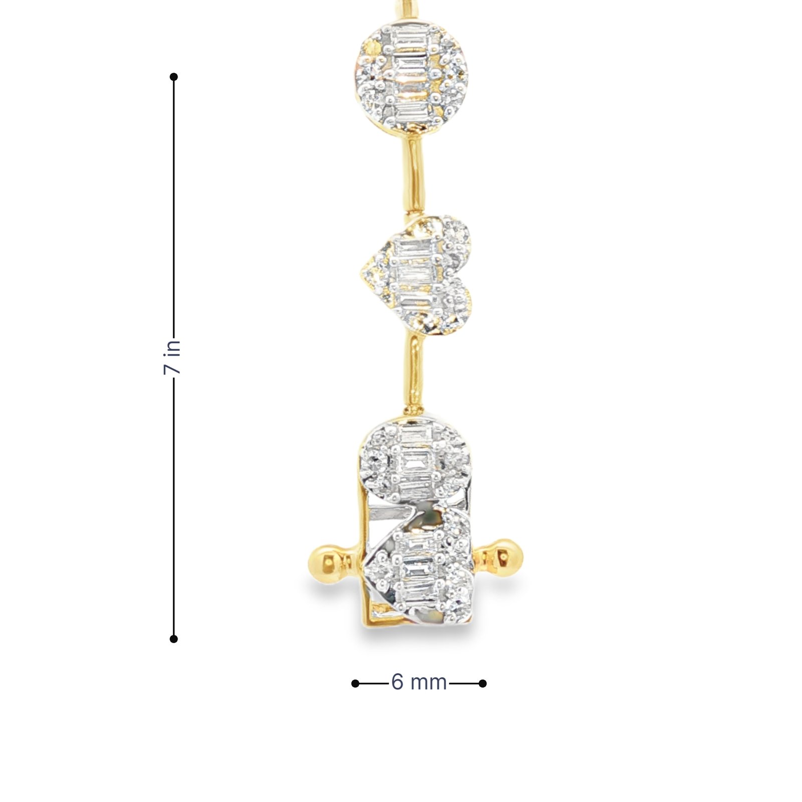 Celebrate love and elegance with this exquisite diamond bracelet crafted in glowing yellow gold. Featuring alternating heart-shaped and round motifs, each one adorned with shimmering baguette and round diamonds, this piece radiates timeless charm. The delicate design incorporates symbols of love and peace, creating a bracelet that is both meaningful and luxurious.