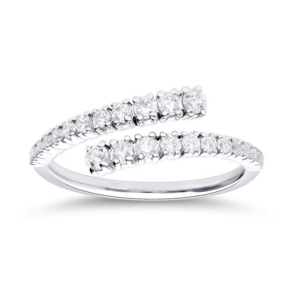 This elegant Round Diamond Bypass Wrap Ring showcases a modern, fluid design with timeless sparkle. Crafted in polished white gold, the ring features two diamond-lined arms that gracefully curve around the finger in a bypass (wrap) silhouette. Each arm is set with brilliant round-cut diamonds, creating a continuous shimmer and a sense of movement from every angle.