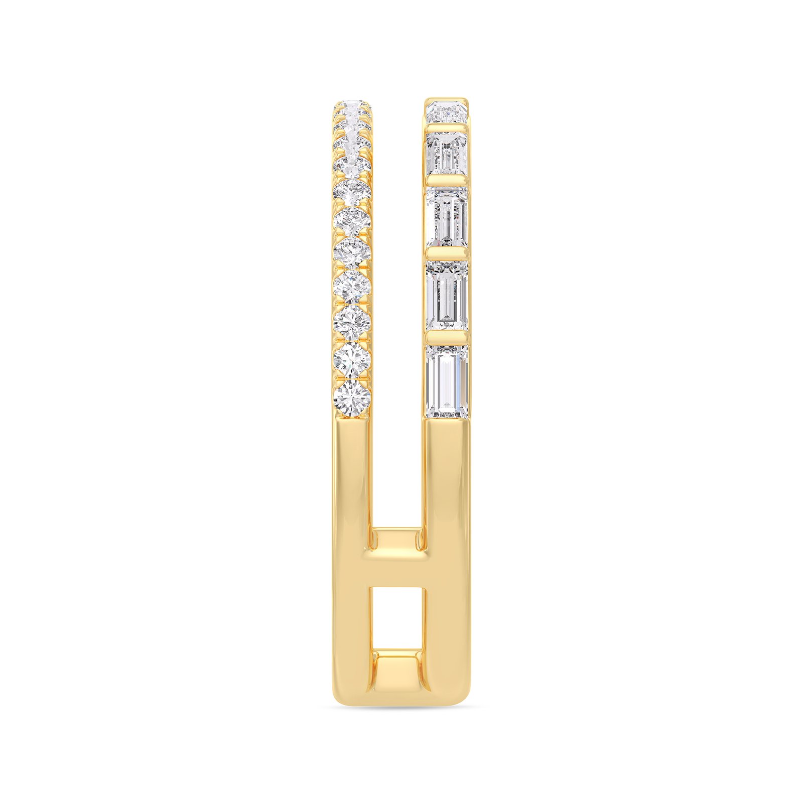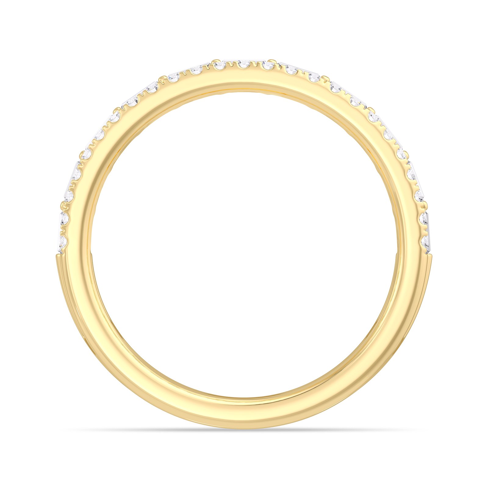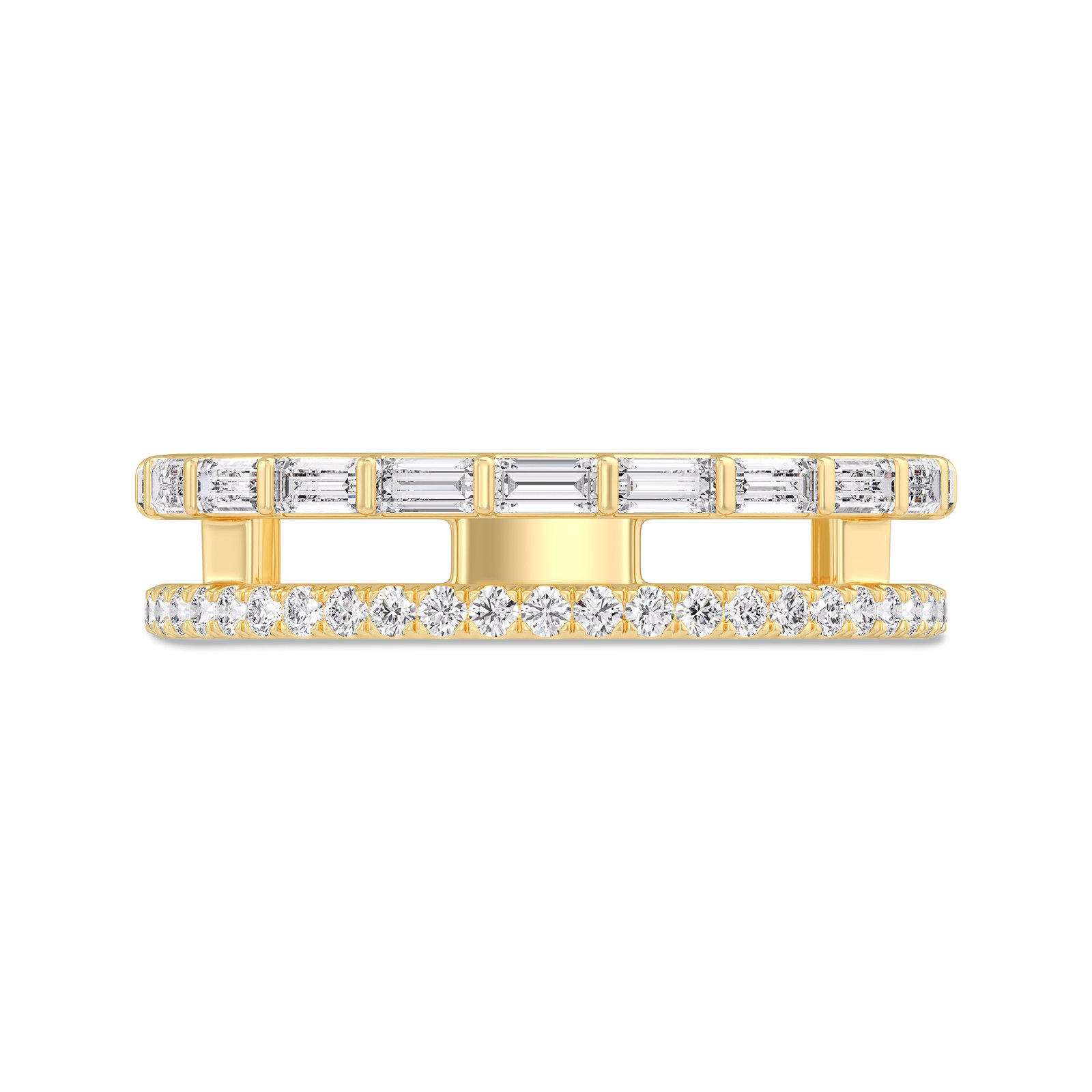 A refined yellow gold band featuring a structured row of baguette-cut diamonds above a line of pavé-set round brilliant diamonds. The clean geometry of the baguettes contrasts beautifully with the soft shimmer of the round stones, creating balanced, layered brilliance.