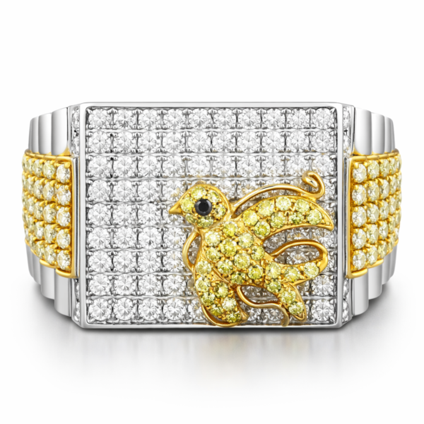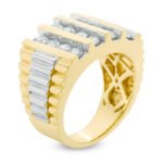 Striking and sophisticated, this two-tone gold multi-row diamond men’s ring is a bold expression of luxury and confidence. Crafted in rich yellow gold with contrasting white gold accents, the design showcases multiple vertical rows of round brilliant diamonds that deliver exceptional sparkle and depth. Polished gold bars frame the diamond rows, creating a powerful, architectural look with a refined finish. Designed for durability and standout style, this ring is perfect for the man who appreciates statement jewelry with timeless appeal.