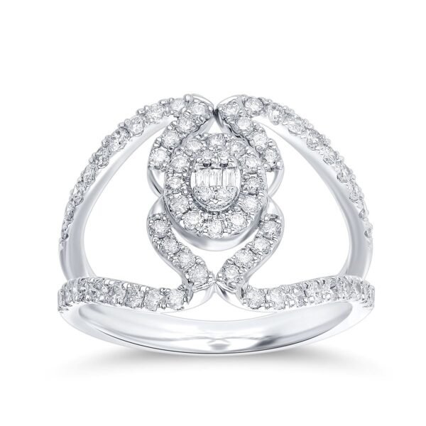 Romantic and brilliantly detailed, this white gold double halo diamond engagement ring is designed to captivate from every angle. The centerpiece features a radiant round brilliant diamond, secured in a classic prong setting and surrounded by two shimmering halos of round brilliant diamonds that amplify sparkle and presence. The split shank band is adorned with pavé-set diamonds, adding elegant depth and continuous brilliance along the finger. Crafted in luminous white gold, this ring is a breathtaking symbol of love, commitment, and timeless sophistication.