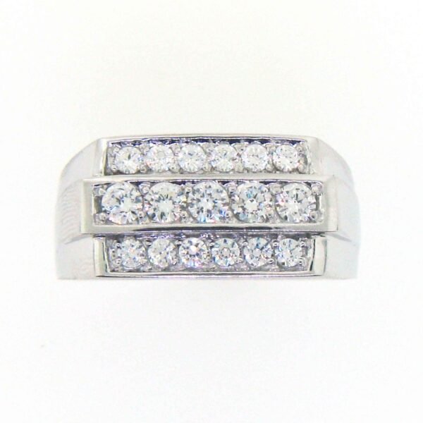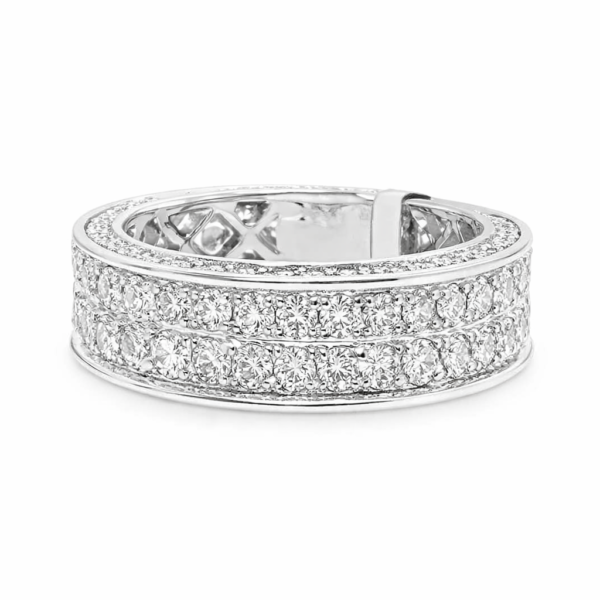 Bold, refined, and powerfully elegant, this white gold multi-row diamond ring is a striking statement of modern luxury. The design features three sleek rows of round brilliant diamonds, meticulously channel-set to create clean lines and a strong architectural presence. Polished white gold borders frame the diamonds, adding depth and contrast while enhancing the ring’s masculine silhouette. Crafted for durability and brilliance, this ring delivers confident style with timeless appeal—perfect for everyday wear or elevated occasions.