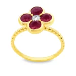 Add a pop of vibrant color and timeless charm to your jewelry collection with this stunning clover-inspired fashion ring. Crafted in luxurious yellow gold, the design features four rich, round rubies forming a clover shape, beautifully accented by a sparkling diamond at the center. The intricate detailing of the band enhances its elegance, making it the perfect piece to wear alone or stack with other rings.